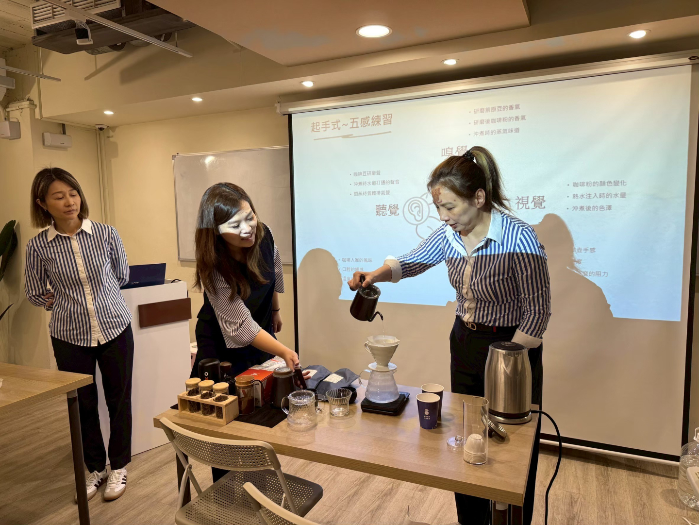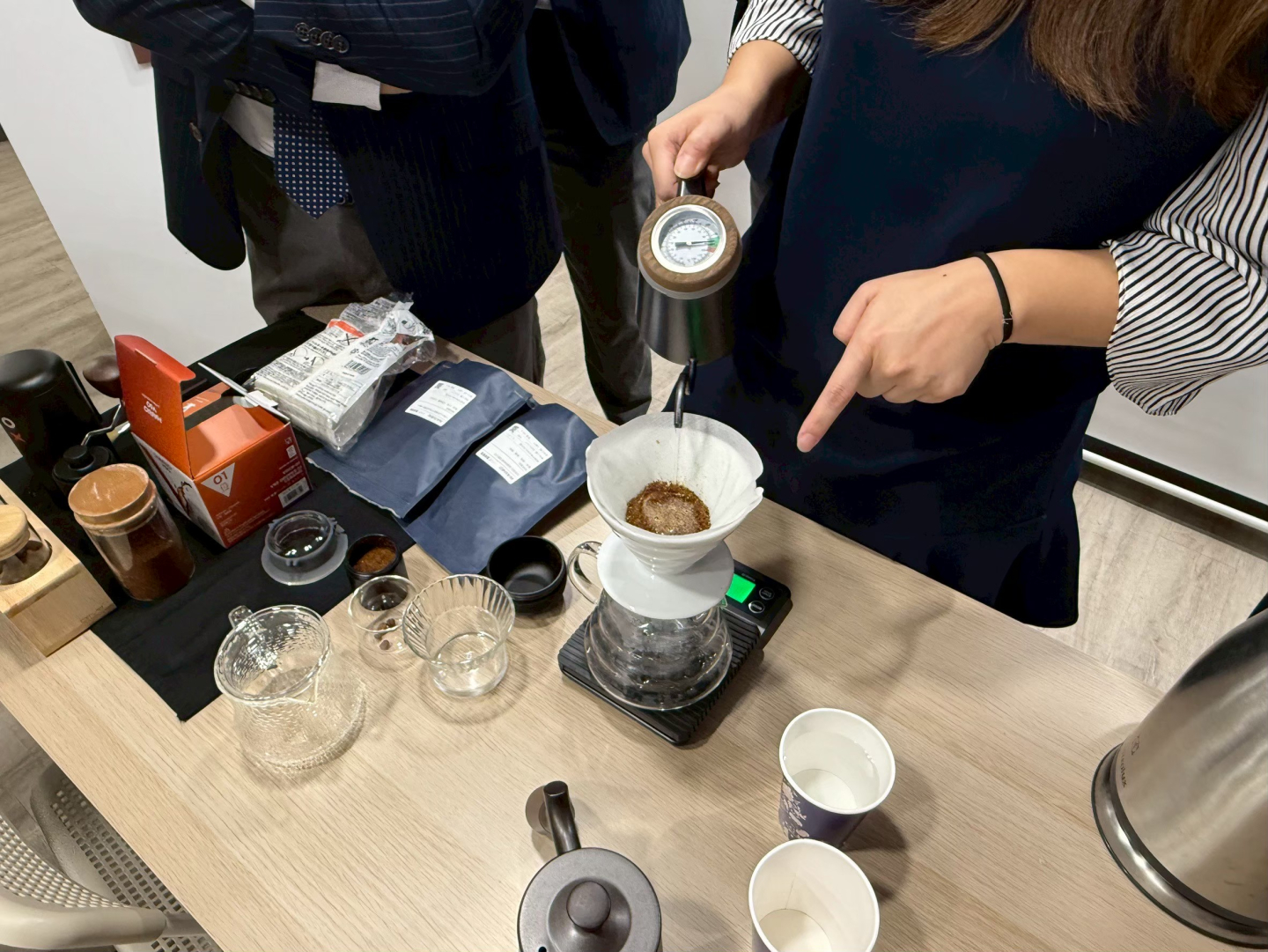 隨後,Sandy以五感為主軸,帶領大家從嗅覺、聽覺、味覺、視覺到觸覺,逐步體驗手沖咖啡的細膩過程。示範環節過後,還邀請同仁親自操作,現場氛圍專注而沉浸,大家透過五感細細品嚐咖啡的層次與厚度。