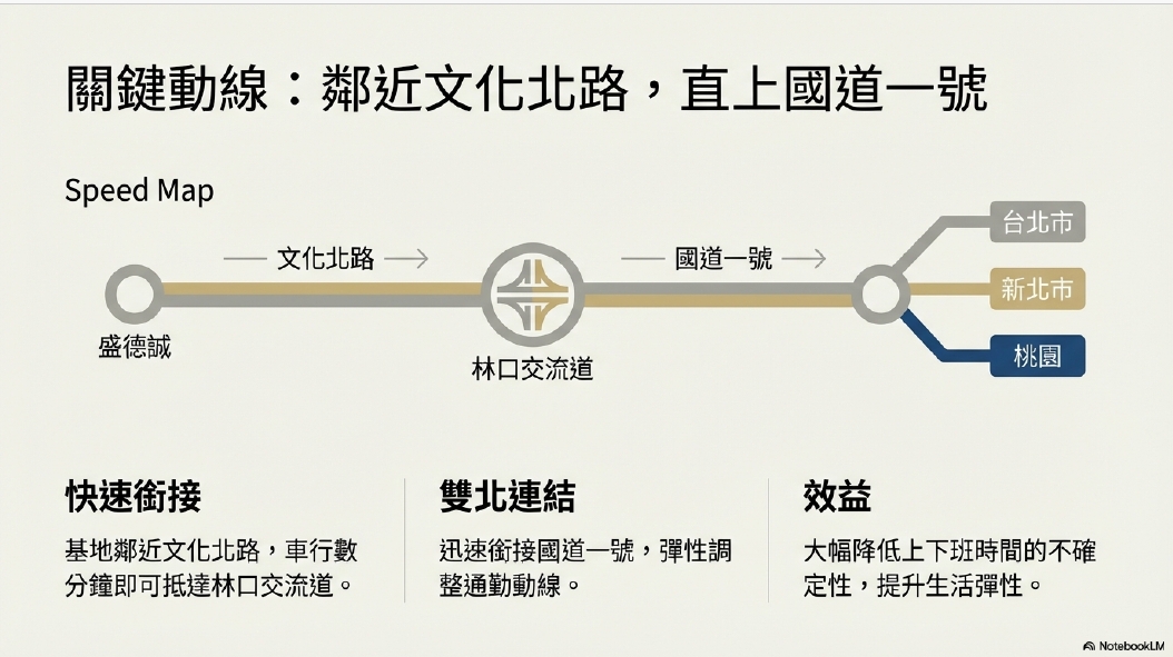 盛德誠基地鄰近文化北路,車行數分鐘即可抵達林口交流道,迅速銜接國道一號,不論往台北市、新北市或桃園地區,都能彈性調整通勤動線。對於開車族而言,這樣的交通配置大幅降低上下班時間的不確定性,也提升生活彈性。