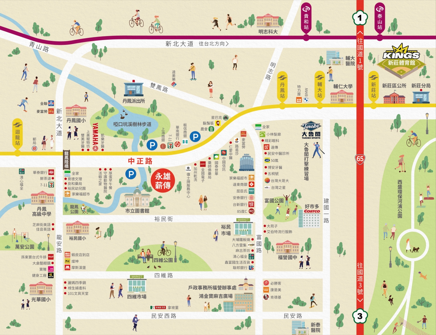⊚完整商圈:costco、uniqlo、特力屋、大魯閣、鴻金寶商圈、西盛商圈等店家密集度高。⊚公眾設施:新莊聯合辦公大樓、國家電影文化中心、新莊體育館、宏匯廣場、宏匯思源i-Tower、凱悅嘉軒酒店、新月橋